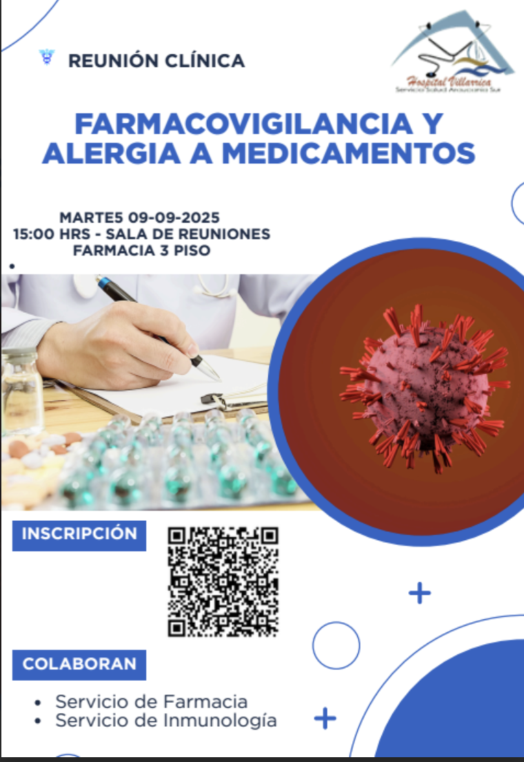 En el marco de la formación continua de profesionales de nuestra institución es que se hace la Invitación Reunión Clínica para el día martes 09-09-2025 a las 15 hrs: "Farmacovigilancia y Alergia a Medicamentos".